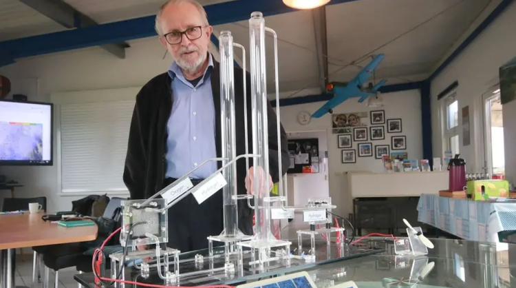 Hasso von Dammann mit dem Modell seiner Wasserstoff-Anlage, mit der er den Flugplatz bereits vor zwei Jahrzehnten zukunftsfest machen wollte. Foto: Birger Bahlo